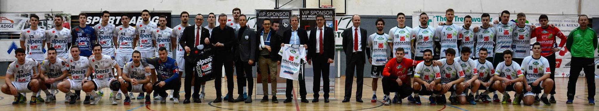 Si è svolto a Merano, in occasione dell’importante partita di campionato tra le due squadre di pallamano, SC Merano e SSV Bressanone, lo “Sparkasse-Day“. La Sparkasse, infatti, è VIP-Sponsor ufficiale delle due squadre che militano entrambi in serie A1. L’avvincente derby ha viso vittorioso lo SC Merano per 22:21 contro la squadra brissinese. Con l’occasione è stata consegnata la maglia ufficiale di entrambi i sodalizi. Nella foto da sinistra Walter Perkmann (Direttore Filiale Maia Alta), Carlo Costa (Vice-Presidente della Sparkasse), Carlo Dal Medico (Presidente SC Merano), Joachim Mair (Capo Area della Sparkasse), Werner Wieland (Responsabile SSV Bressanone pallamano), Johann Reinthaler (Direttore Filiale Merano) e Hanspeter Oberhofer (Consulente Piccole Imprese della Sparkasse).