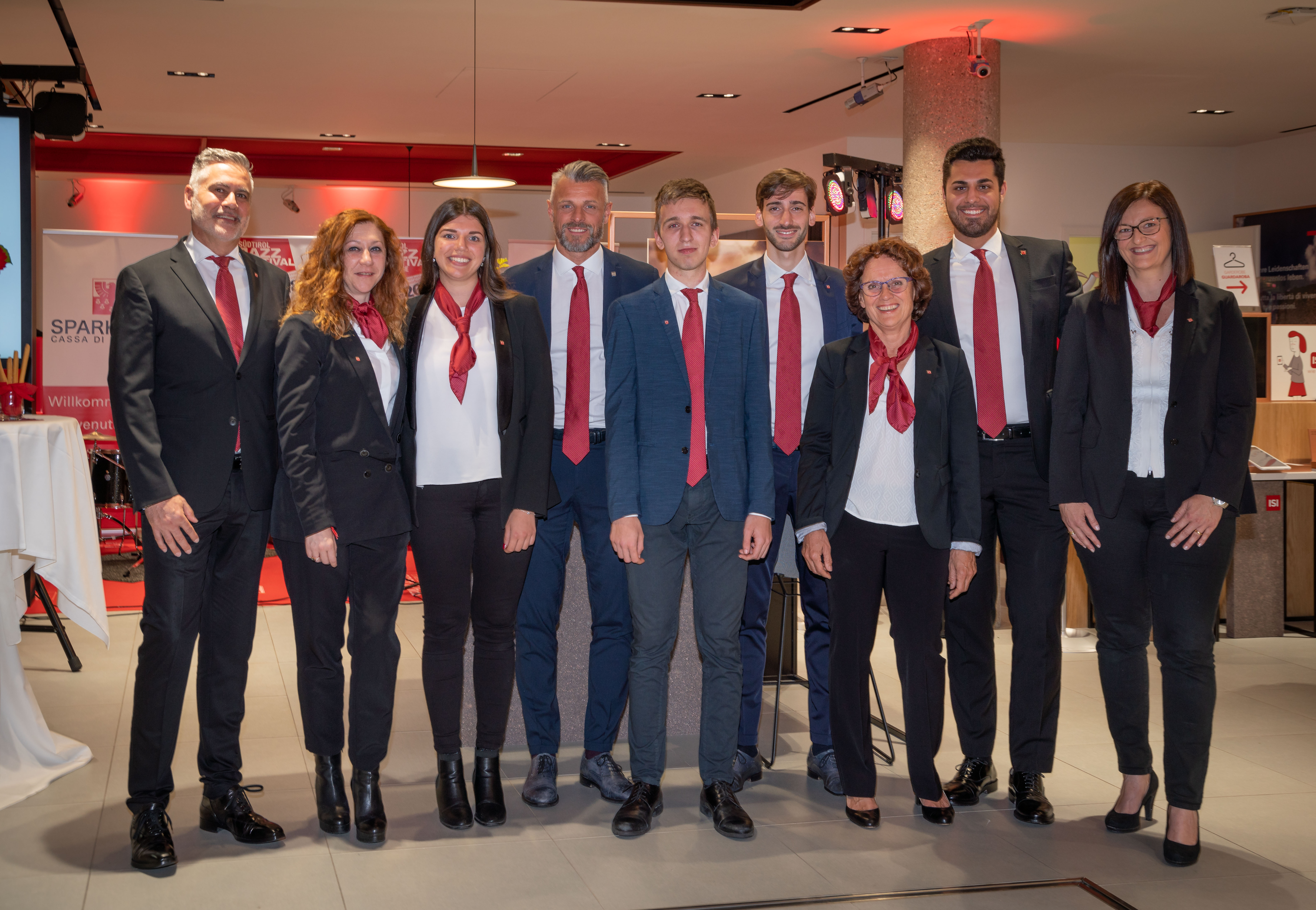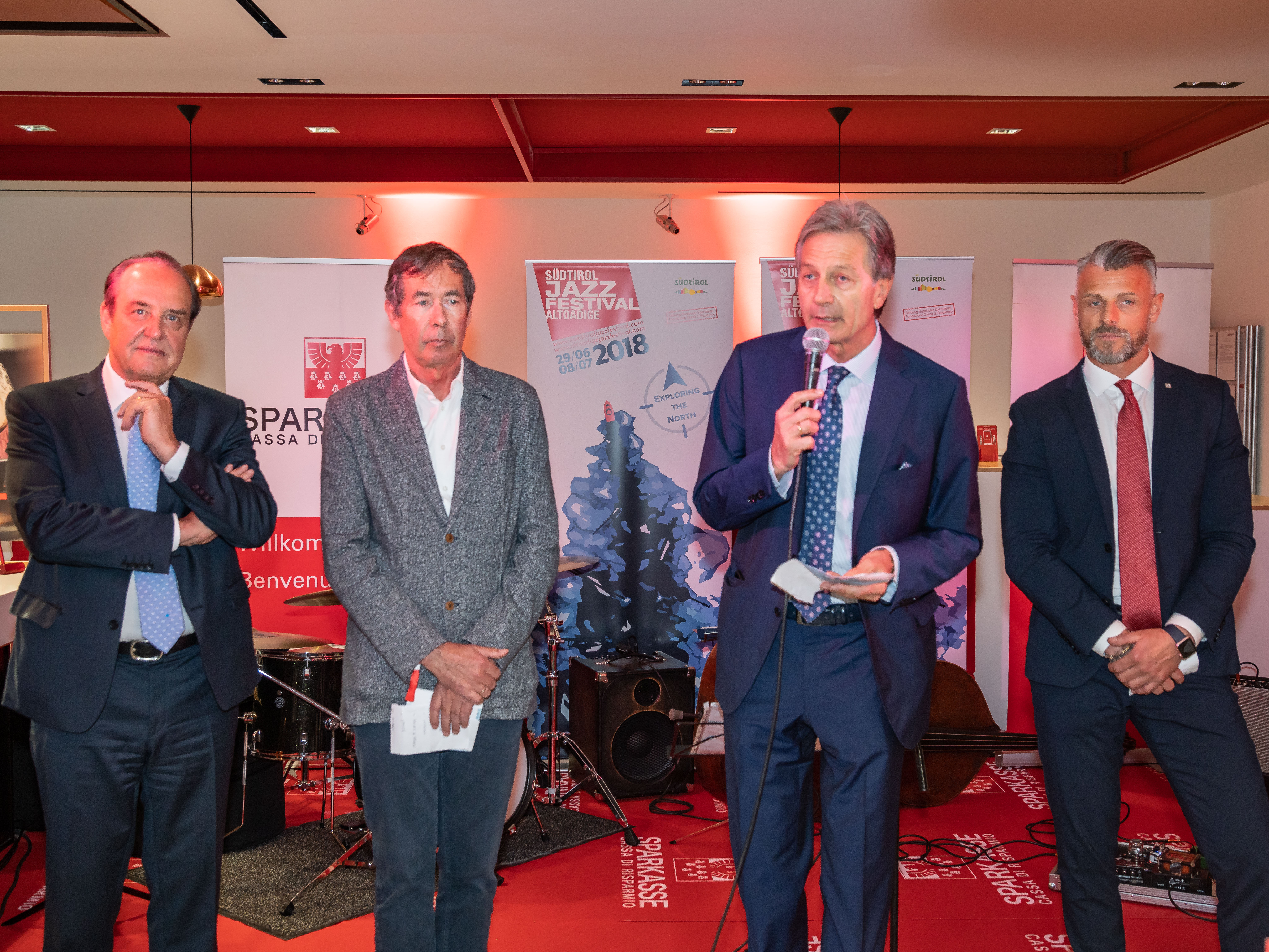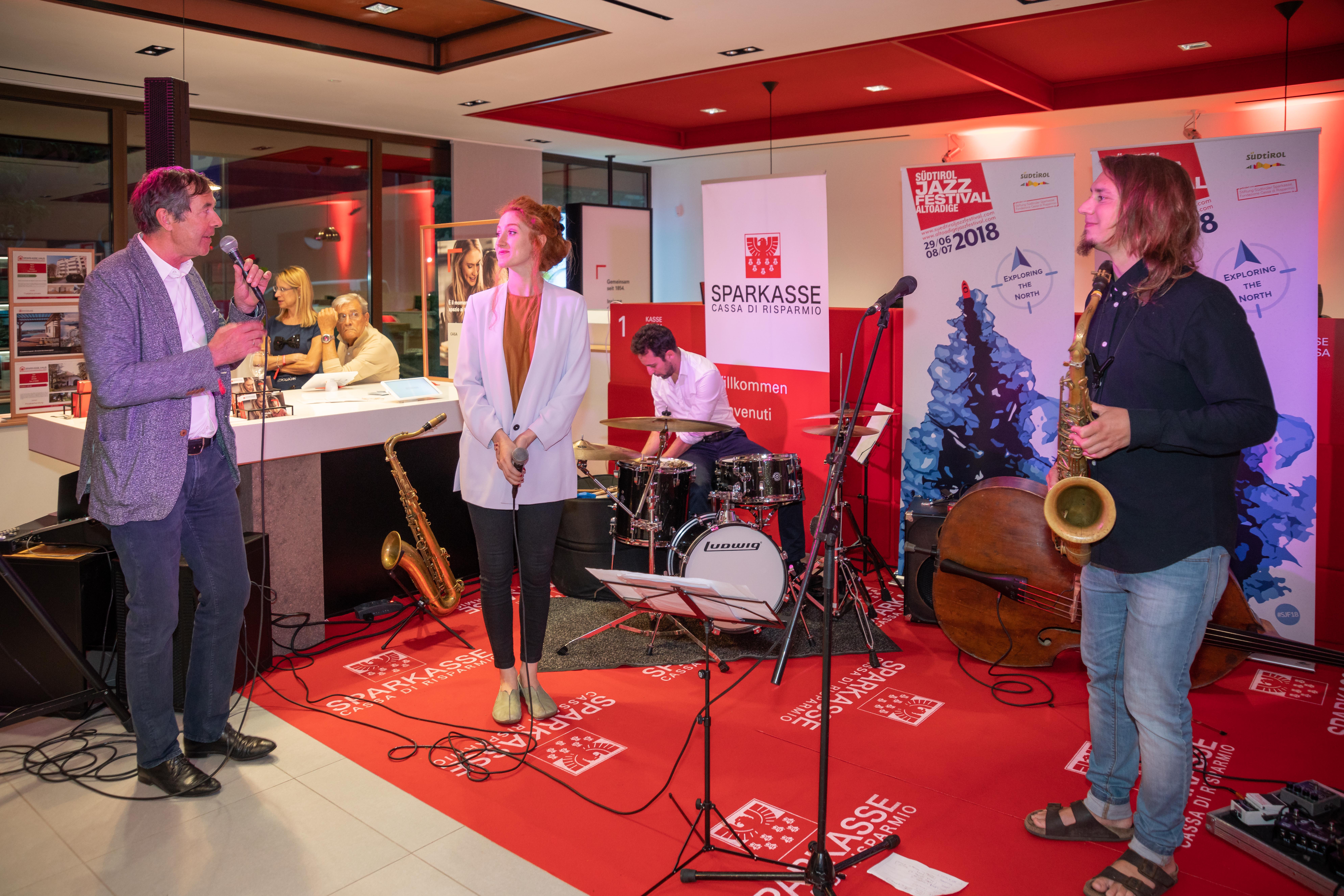 Ha fatto gli onori di casa il Direttore della filiale, Michael Forer, mentre Klaus Widmann, Presidente di Jazz Festival Alto Adige, ha introdotto il gruppo musicale, ed Erwin Pomella, ha presentato i vini della cantina di Termeno. Ha allietato la serata la band Euregio Collective.