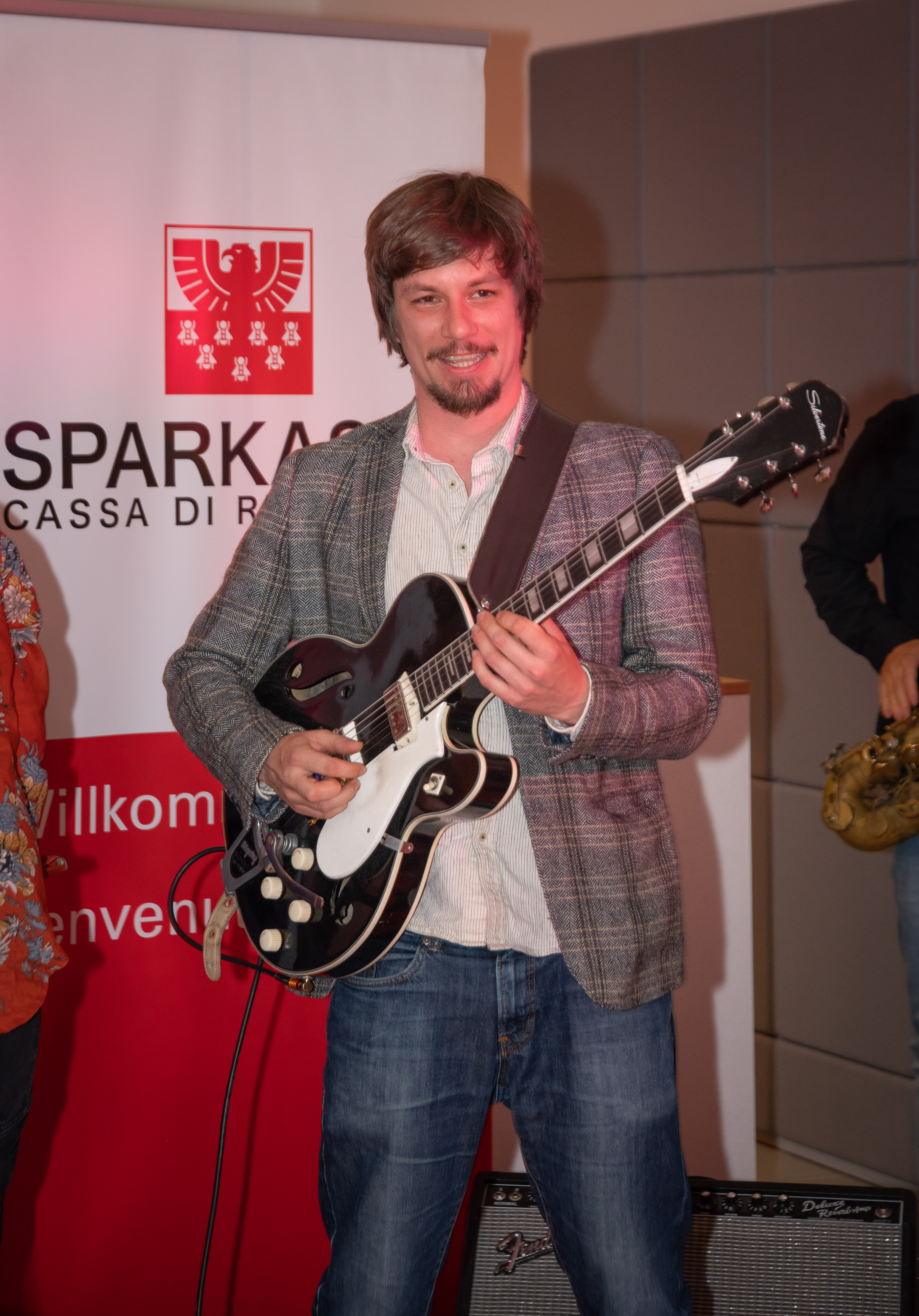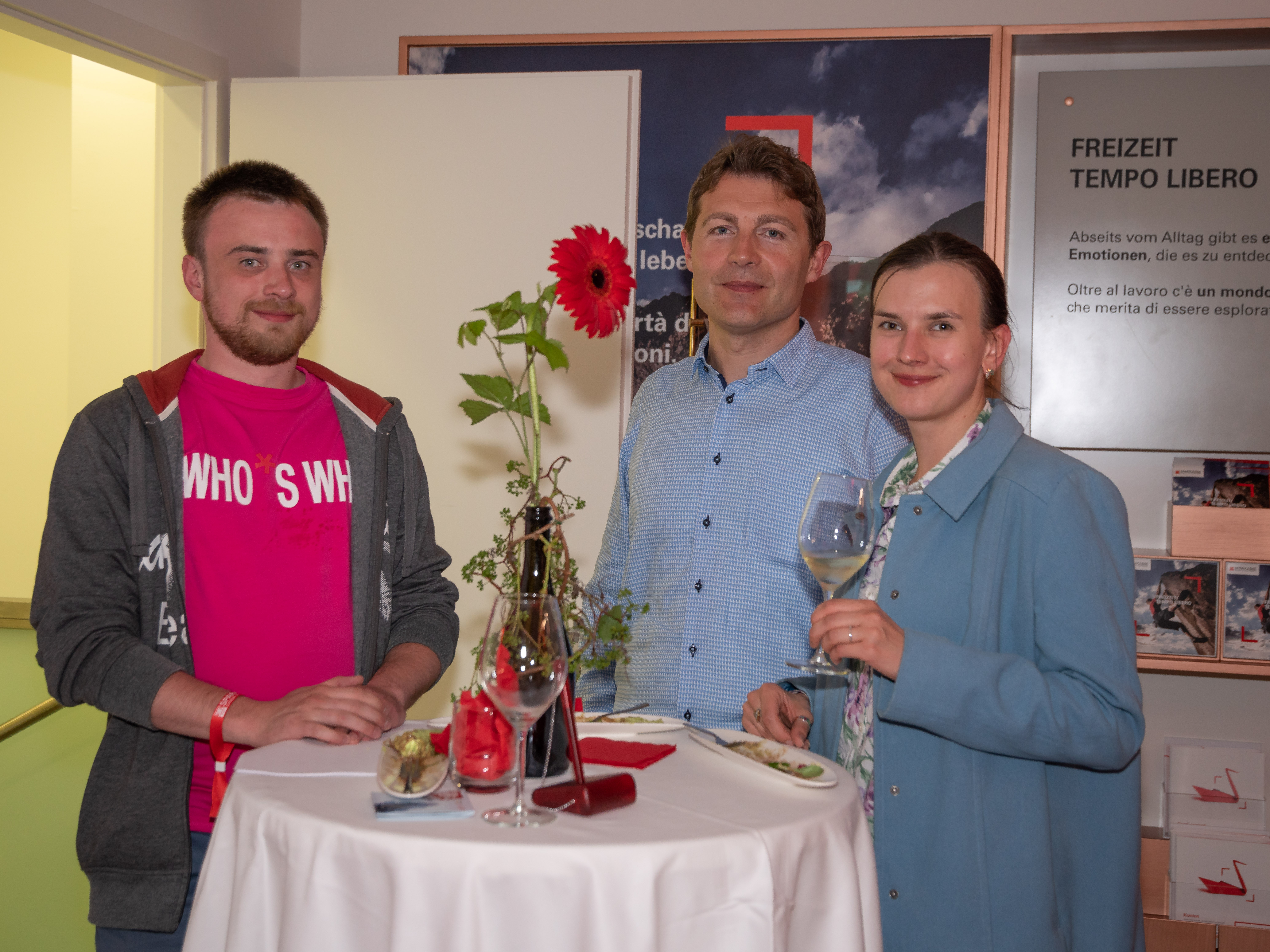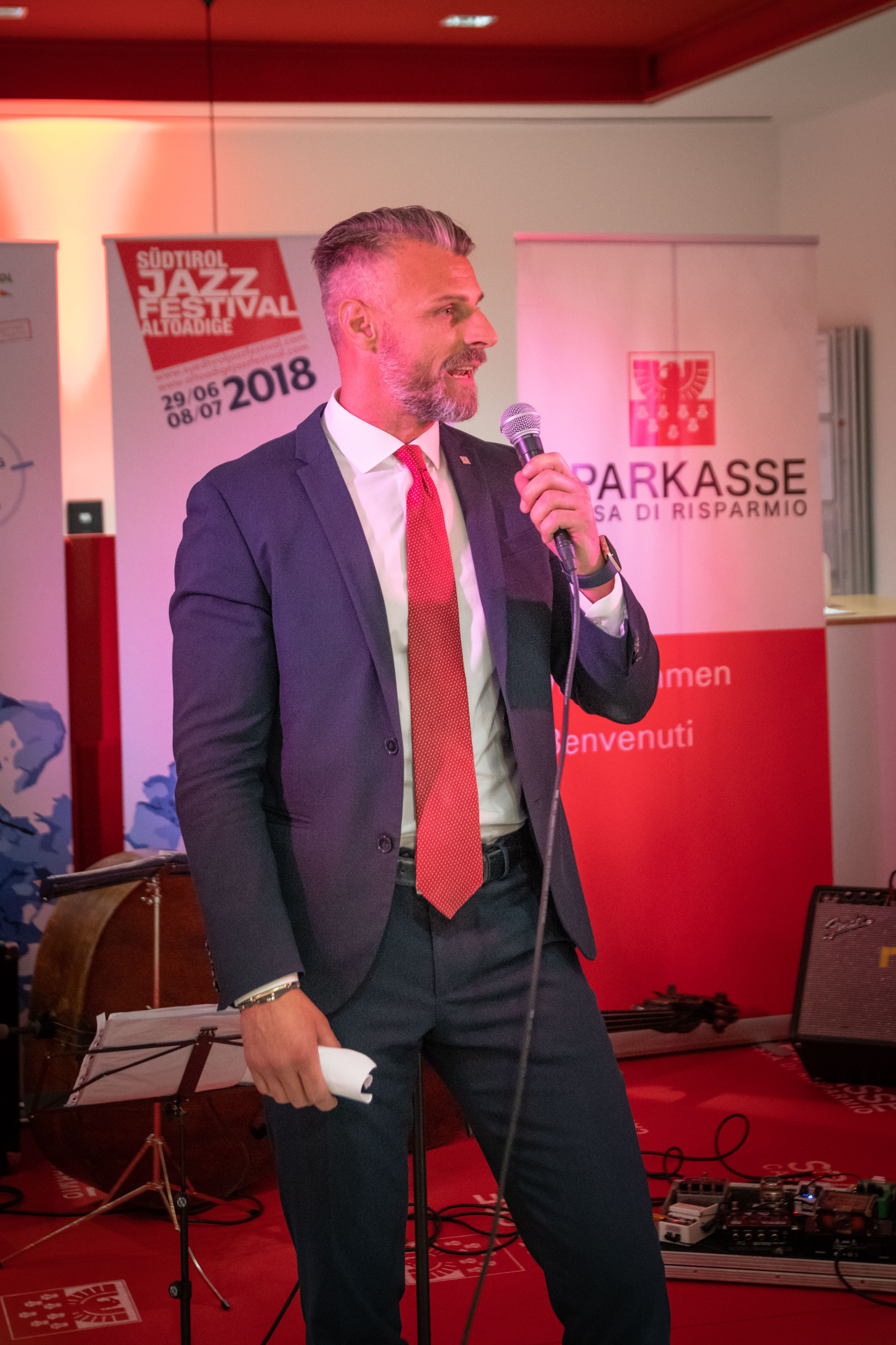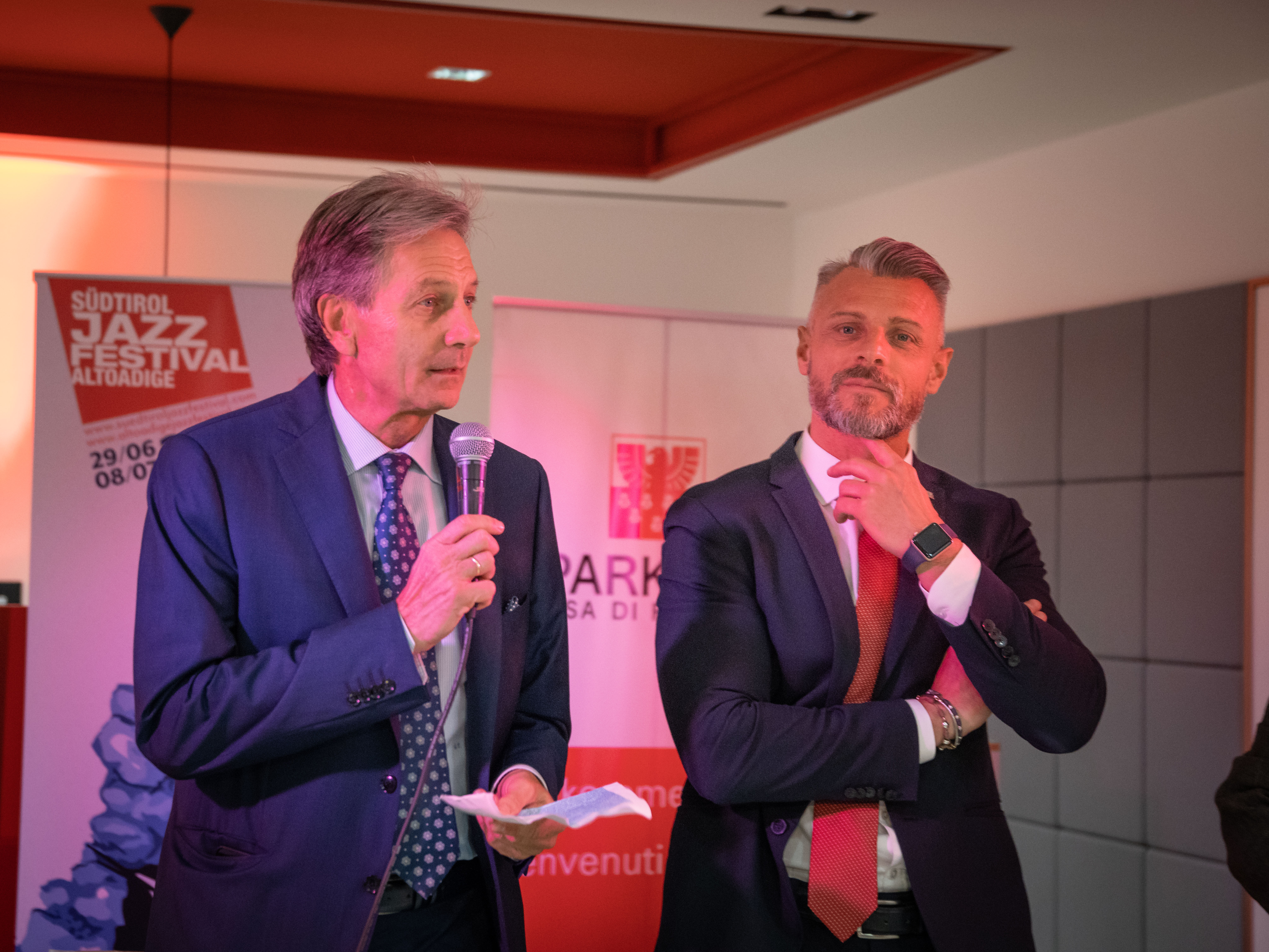 Ha fatto gli onori di casa il Direttore della filiale, Michael Forer, mentre Klaus Widmann, Presidente di Jazz Festival Alto Adige, ha introdotto il gruppo musicale, ed Erwin Pomella, ha presentato i vini della cantina di Termeno. Ha allietato la serata la band Euregio Collective.
