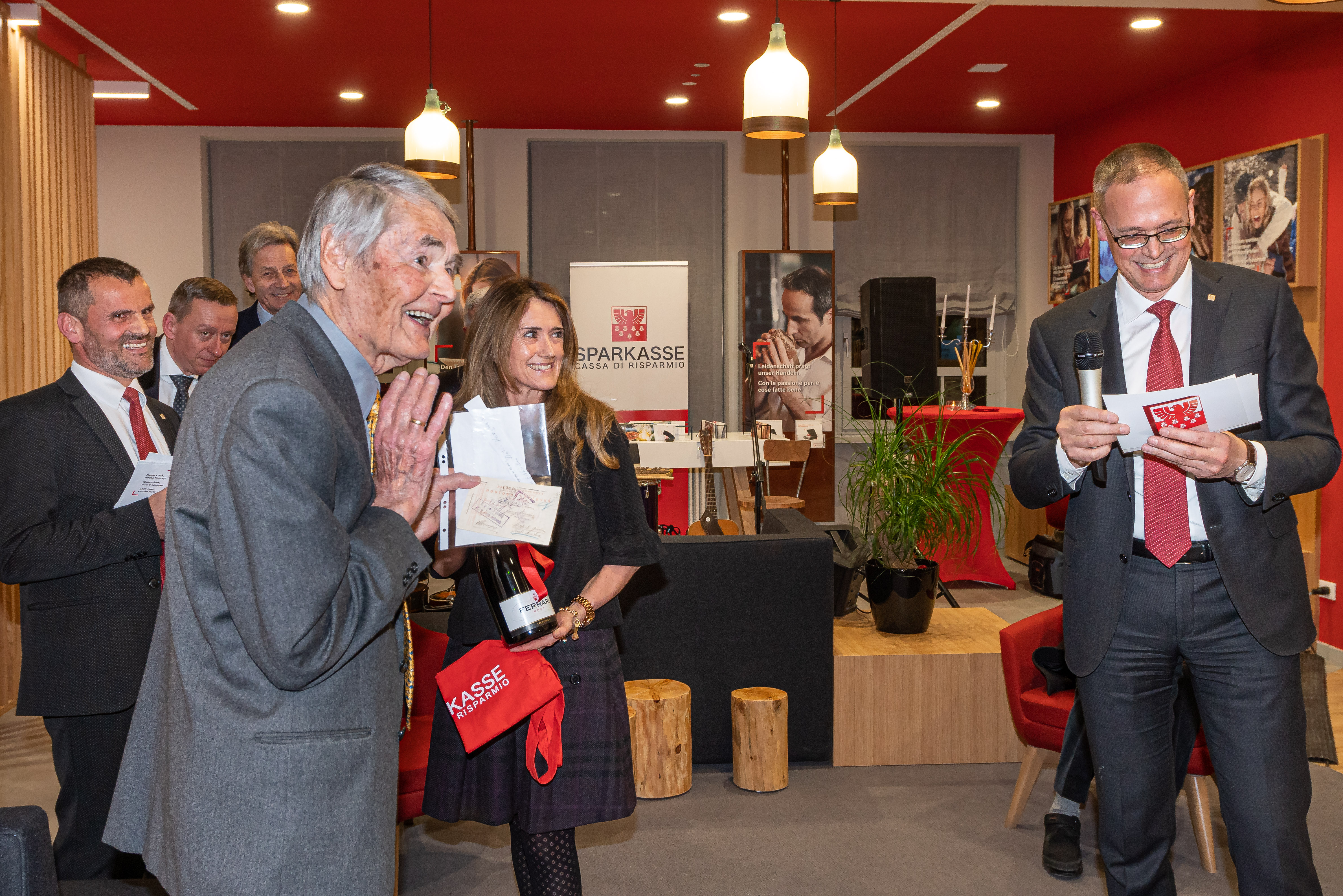 La festa di ieri in Val Gardena è stata, inoltre, il primo di sette eventi per festeggiare il 165° anniversario di fondazione della Cassa di Risparmio. Infatti, la Cassa di Risparmio di Ortisei è stata una delle sette banche fondatrici che successivamente sono state fuse in un’unica Cassa di Risparmio in provincia di Bolzano. Così alla festa era presente Franz Moroder-Costa, l’ultimo nipote ancora in vita del fondatore Franz Moroder-Lenert. In occasione di questo anniversario, la Sparkasse ha donato un sostanzioso importo alla locale Conferenza di San Vincenzo, che il Presidente della banca, Gerhard Brandstätter, ha consegnato alla responsabile Erna Perathoner-Moroder. Il Decano Vijo Pitscheider, infine, ha benedetto la nuova filiale.