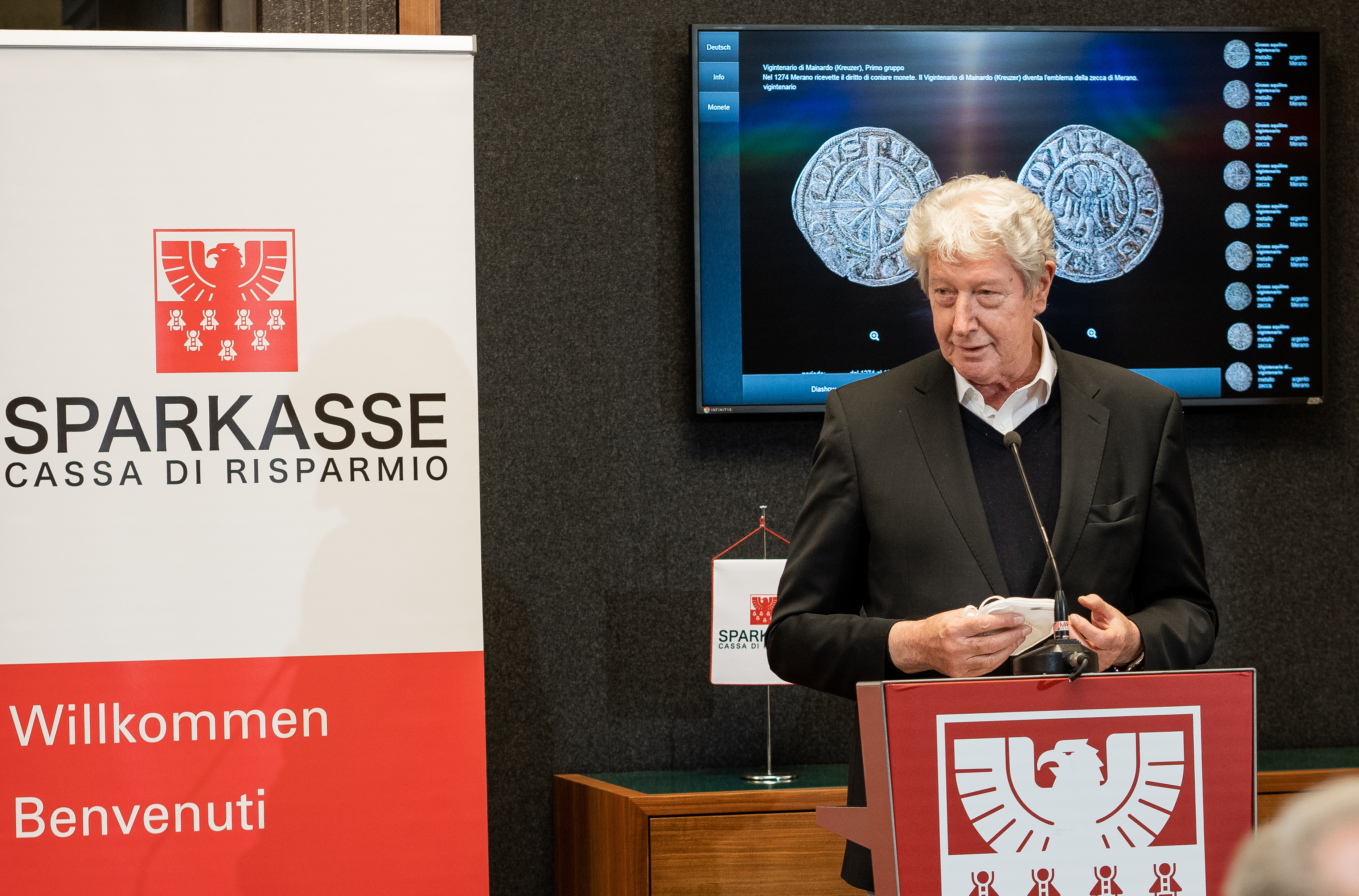 “Sparkasse ha acquistato il prezioso tesoro composto di oltre 4.000 monete d’argento, sotterrato a Padova intorno all’anno 1329. Questo tesoro, importantissimo per la numismatica, è stato a suo tempo acquistato per poterlo conservare nella sua interezza e per evitare che venisse disperso attraverso la vendita delle singole monete,” spiega il Presidente Gerhard Brandstätter e aggiunge: “Vogliamo rendere maggiormente accessibile questo meraviglioso patrimonio culturale, sia con l’esposizione digitale, sia con la pubblicazione del libro che ne documenta l’importanza. Siamo grati all’autore prof. Helmut Rizzolli, che in quest’opera ha messo a frutto tutte le sue conoscenze e le sue ricerche inerenti al mondo finanziario medievale. Inoltre, è previsto che in futuro l’esposizione circolerà in tutte le nostre filiali del Nordest come una sorta di mostra itinerante.”