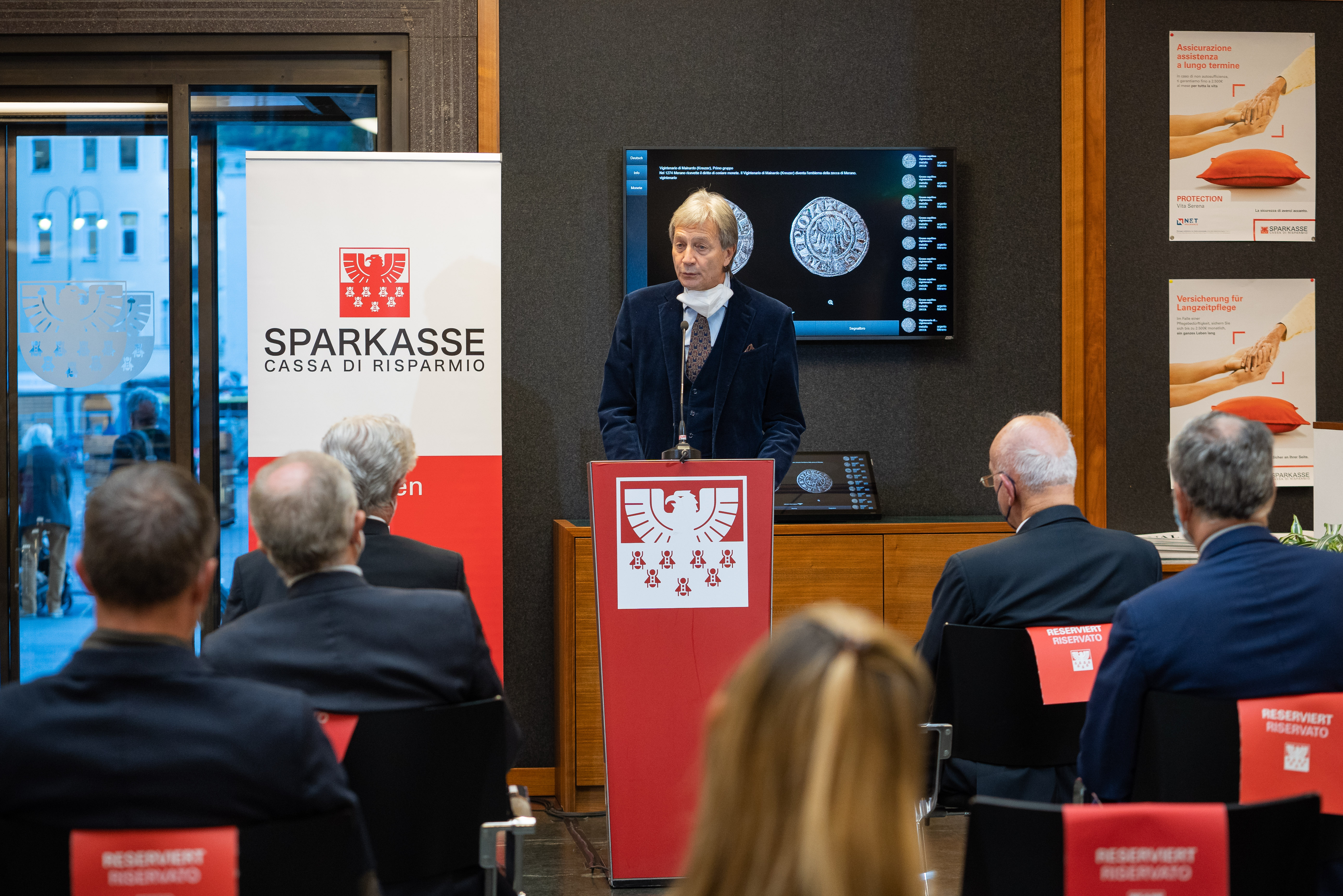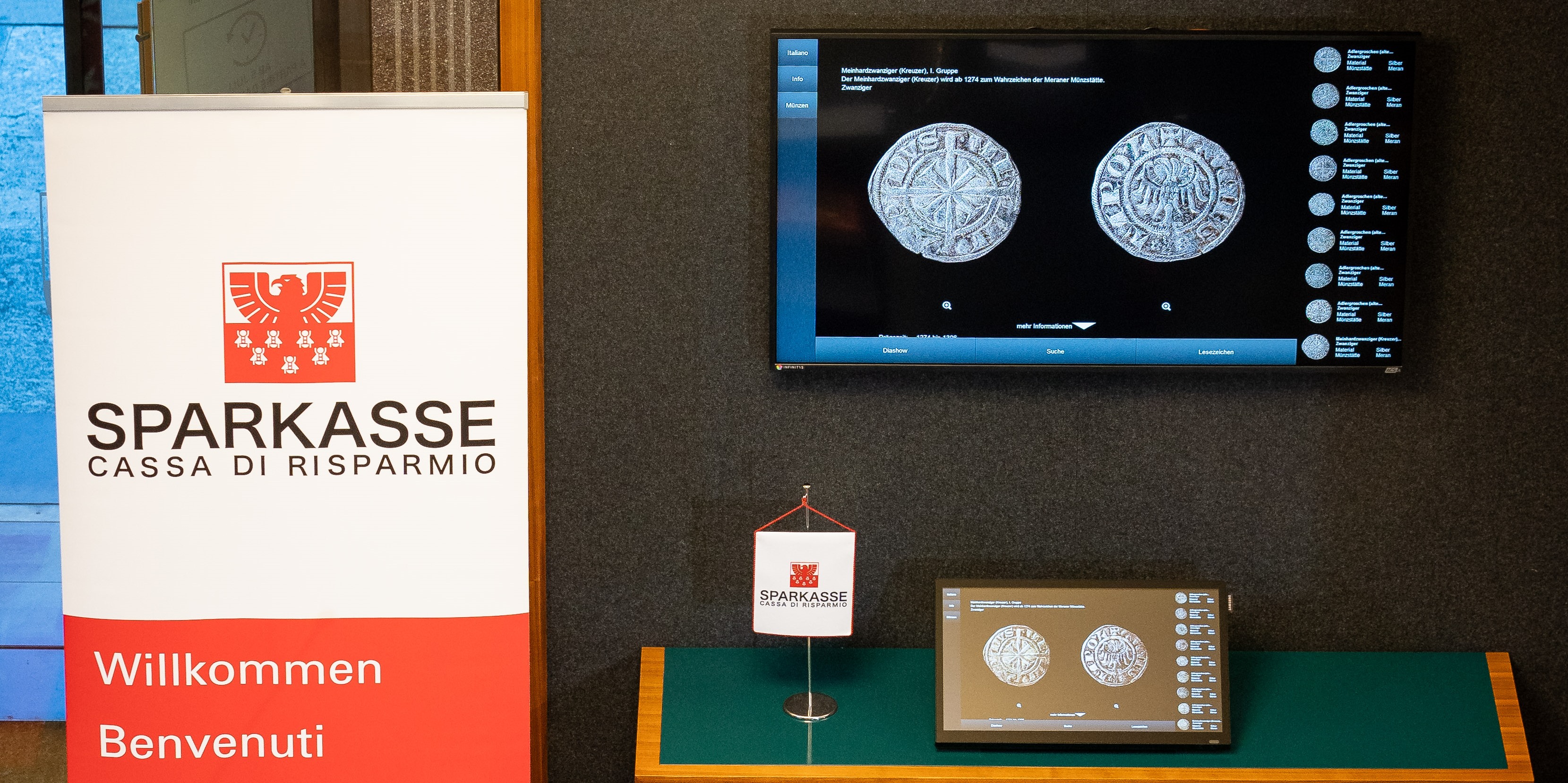 Il prezioso tesoro di Padova di monete medievali, acquistato dalla Sparkasse oltre 30 anni fa, è ora esposto nella filiale di Piazza Walther a Bolzano, dove si può ammirare in forma digitale: attraverso touchscreen e un grande schermo è possibile visualizzare le monete selezionate virtualmente in perfetto ingrandimento e allo stesso tempo è possibile informarsi sulla storia monetaria e bancaria medievale. Con l’occasione è uscito su iniziativa di Sparkasse anche un libro dal titolo “Monete e banche medievali tra le Alpi e l’Adriatico“. L’evento, rispettando le norme anti-Covid, si è svolto in ambito ristretto, mentre è stato possibile seguirlo online in diretta streaming.